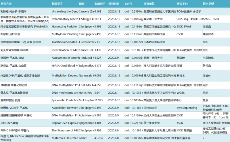 转眼 6 月已经过去啦,小编在这里为大家精心收集了以 DNA 甲基化研究为主题的较新研究成果,截止现在,6 月以 DNA methylation 为关键词检索到的文献一共有 451 篇,小编在这里为大家精心挑选一下 7 篇作为重点分享,包括 多组学研究、甲基化标志物研究、HBV 感染对 DNA 甲基化影响以及一些容易模仿的纯分析文章、还有较新发表的外泌体中 DNA 甲基化的检测技术 等。在文末附表中列出更多 DNA 甲基化研究的文献和高分综述的研究方向、登刊时间、技术平台和摘要等信息,让您不用再费时费力搜索,就能轻松获取 6 月较新的 DNA 甲基化研究成果和动态,平均 IF>8。